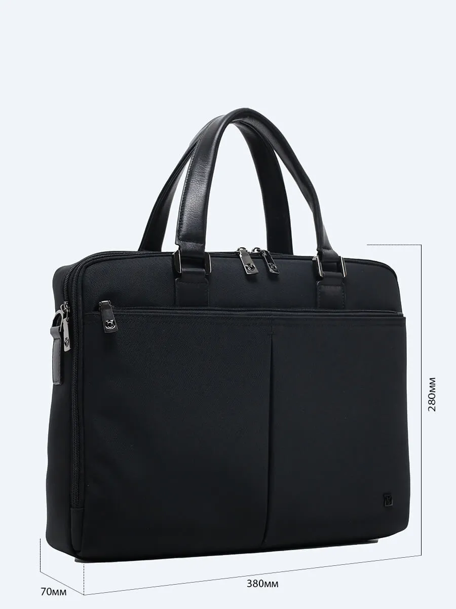 Портфель выполнен из текстиля в сочетании с натуральной кожей. Имеет множество функциональных карманов.