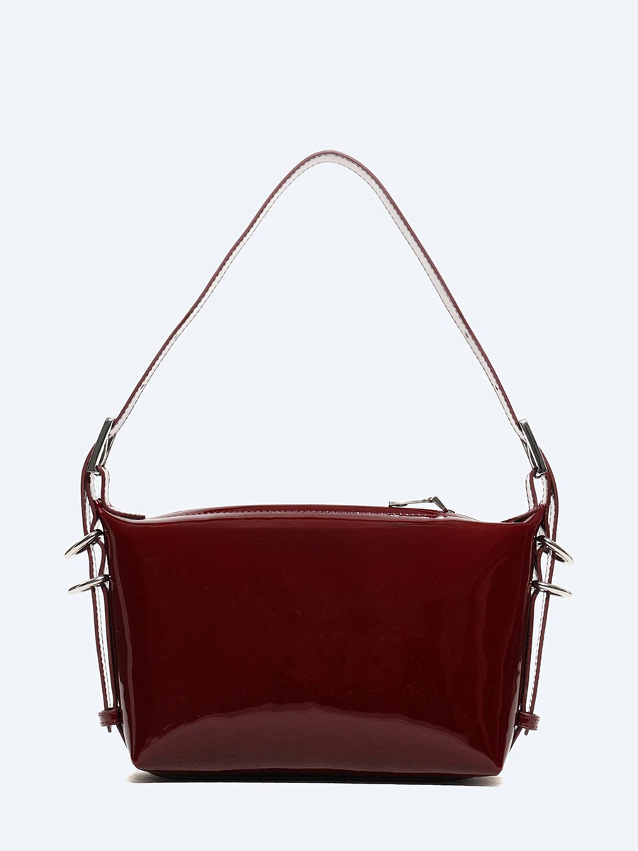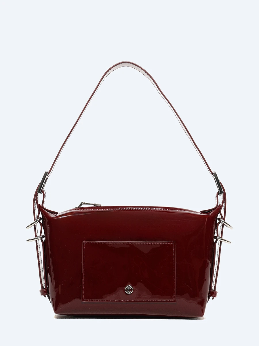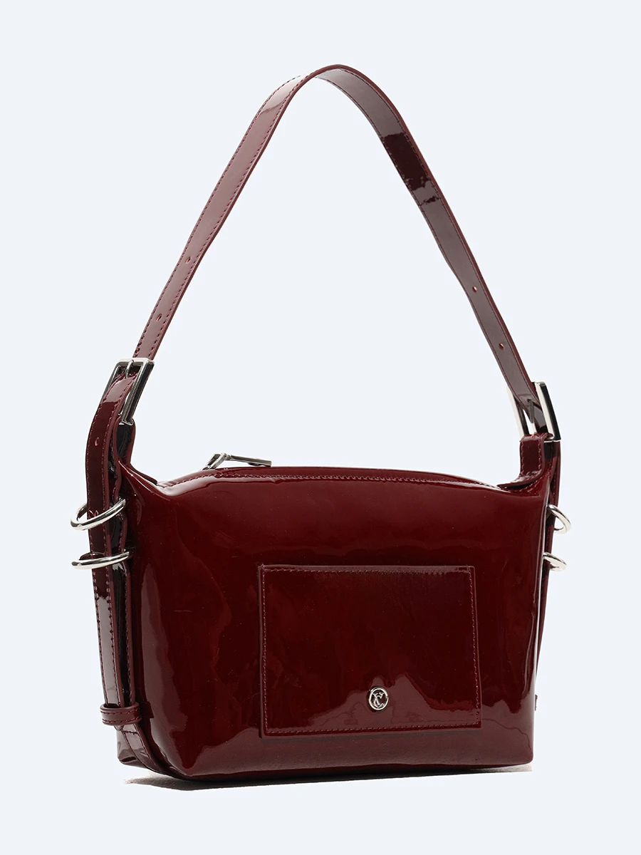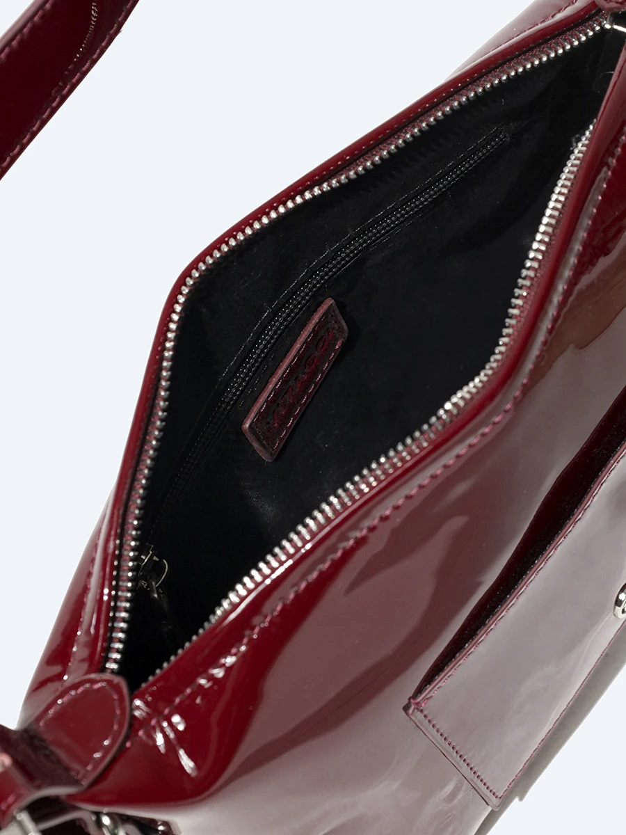 Сумка из натурального лака закрывается на молнию, имеет одно отделение, один внешний открытый карман сзади, один внутренний карман на молнии, один внутренний открытый карман. Длина ремня регулируется при помощи пряжки.