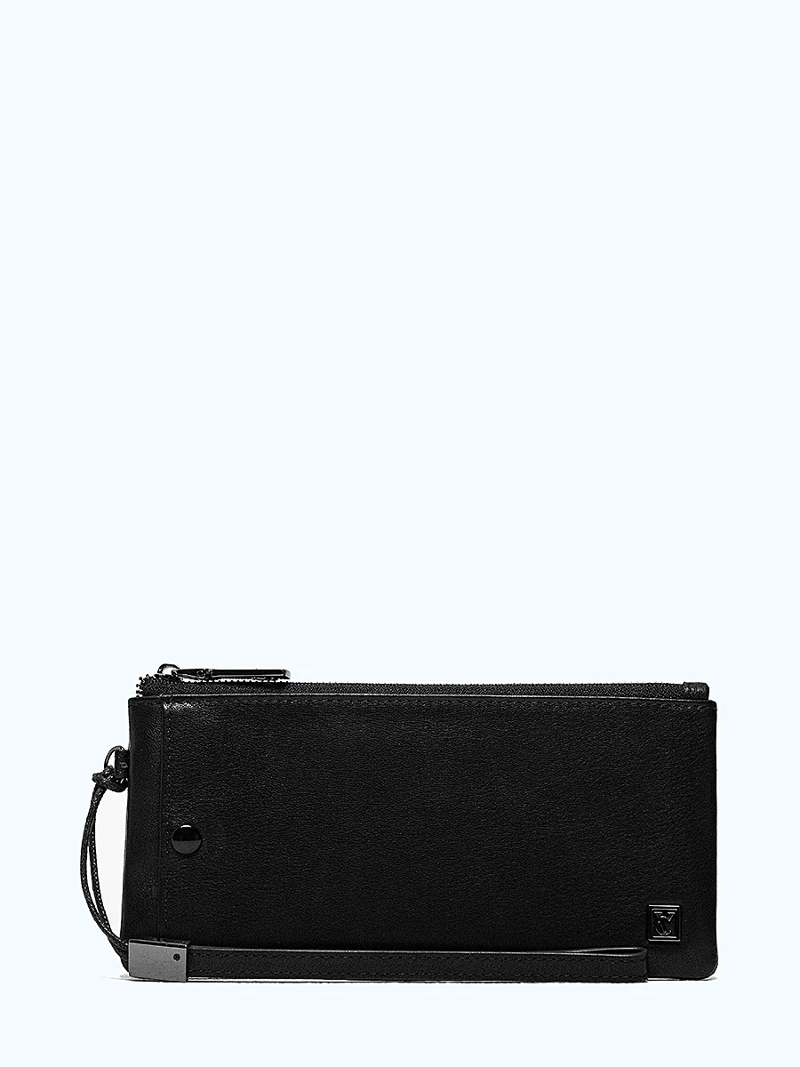 Бумажник выполнен из натуральной кожи. Закрывается на молнию. Дополнительно прилагается ремешок для ношения на запястье.