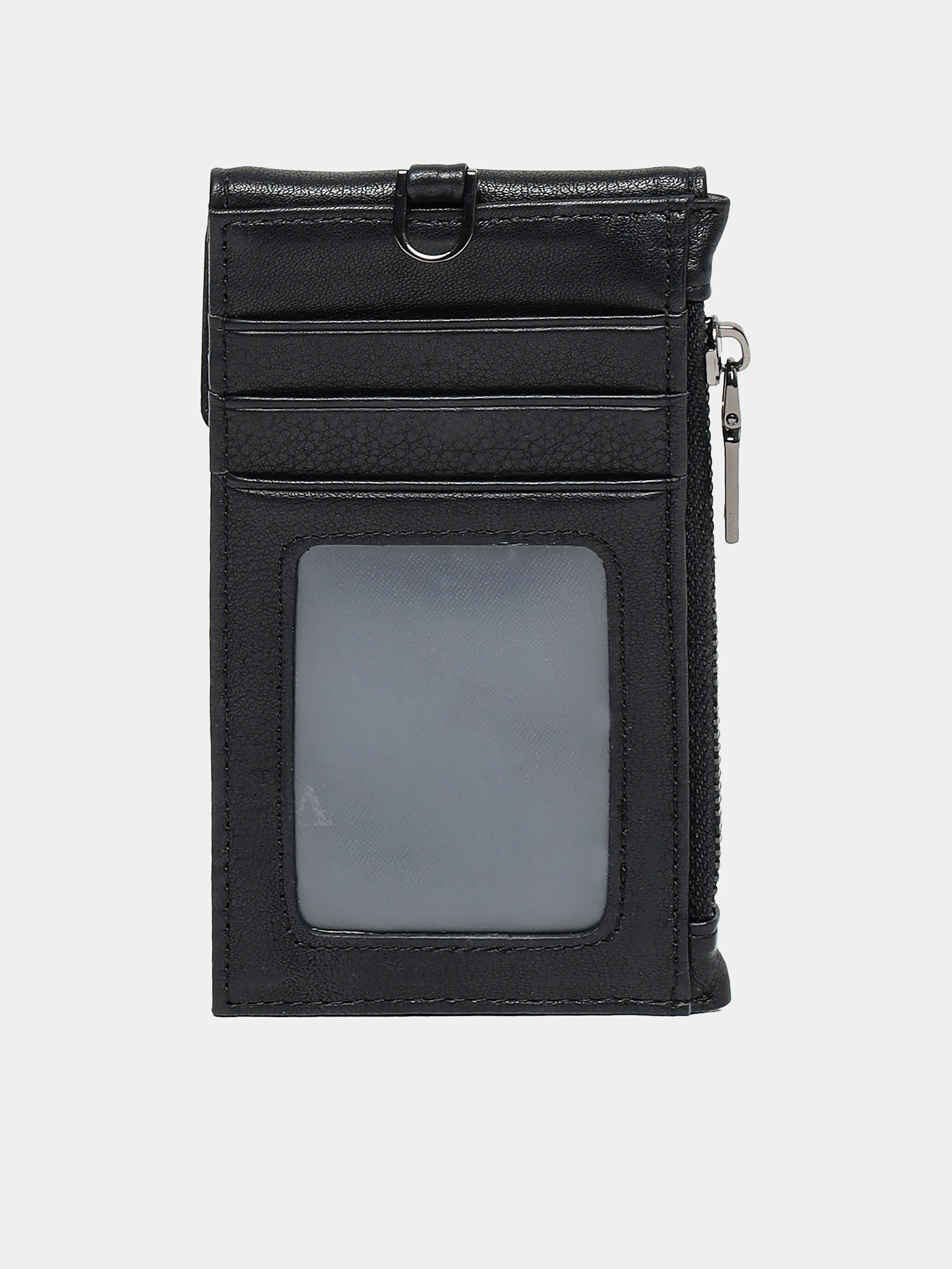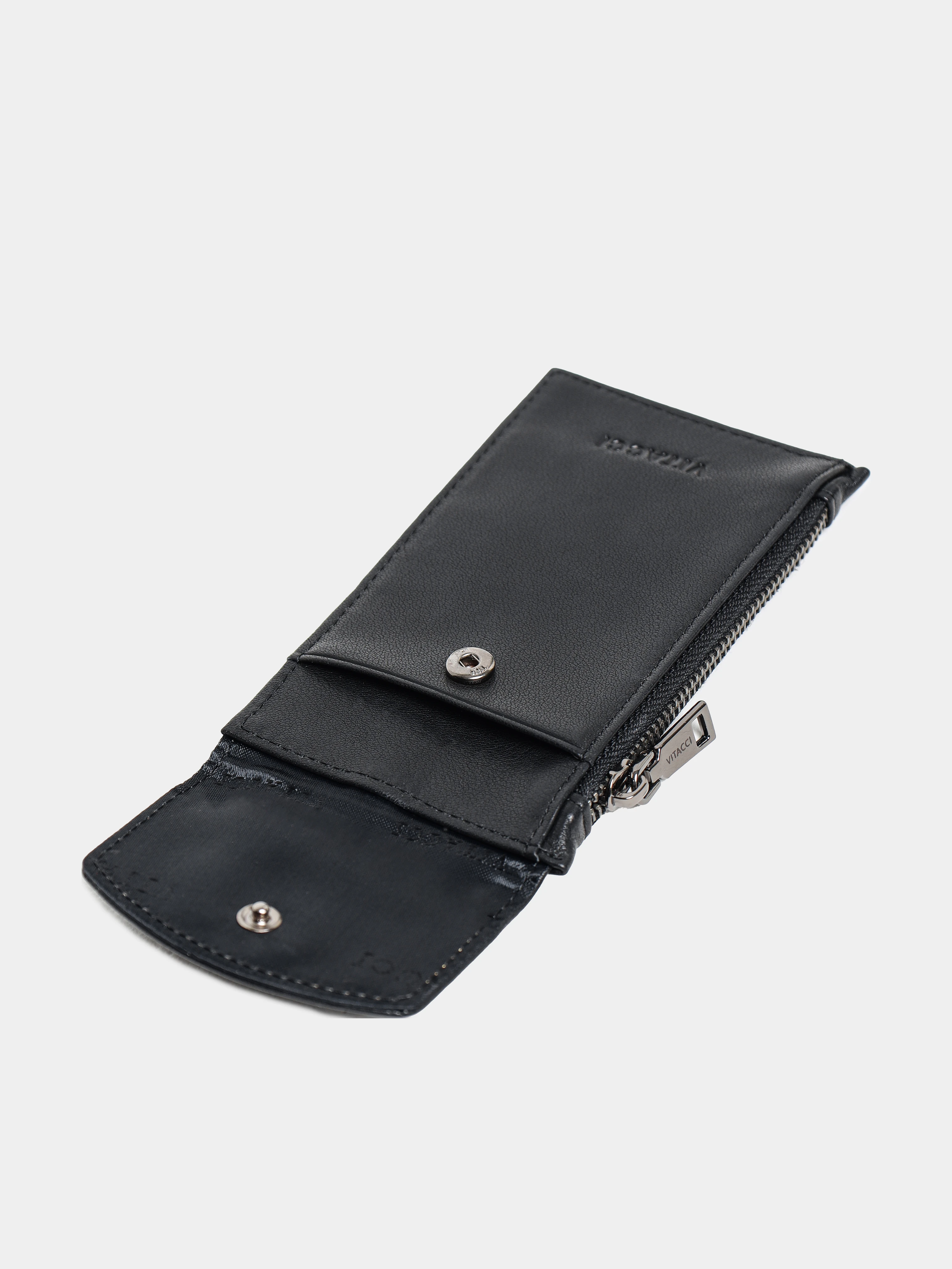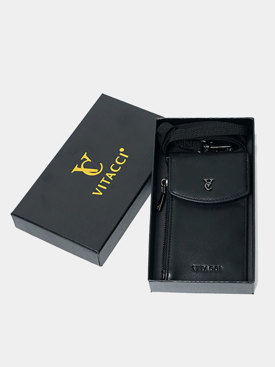 Кошелек из натуральной кожи. В комплекте прилагается ремешок с карабином для ношения на шее. Кошелек оснащен тремя отсеками для пластиковых карт, одним отделением на молнии и еще одним отделением на кнопке.