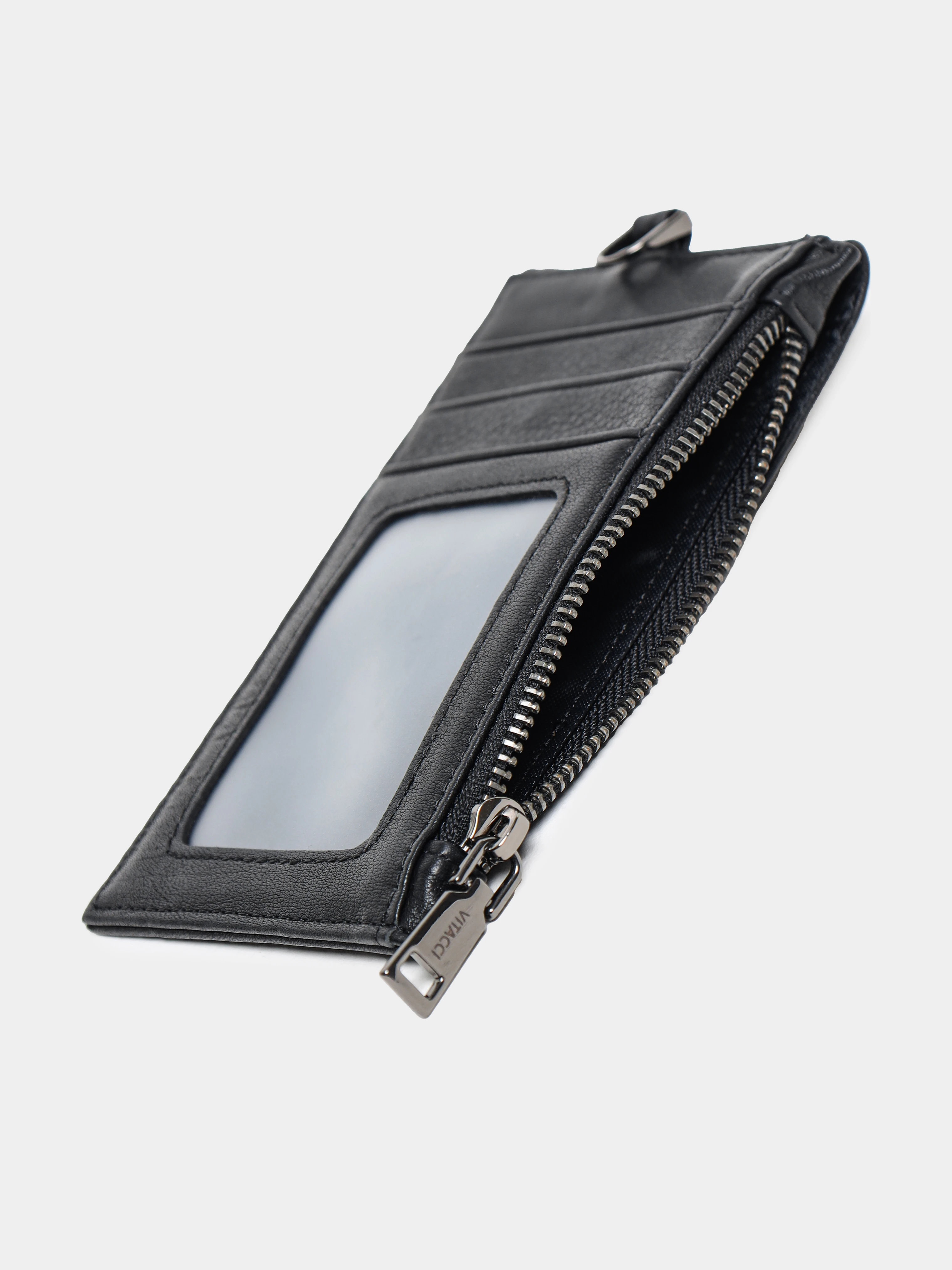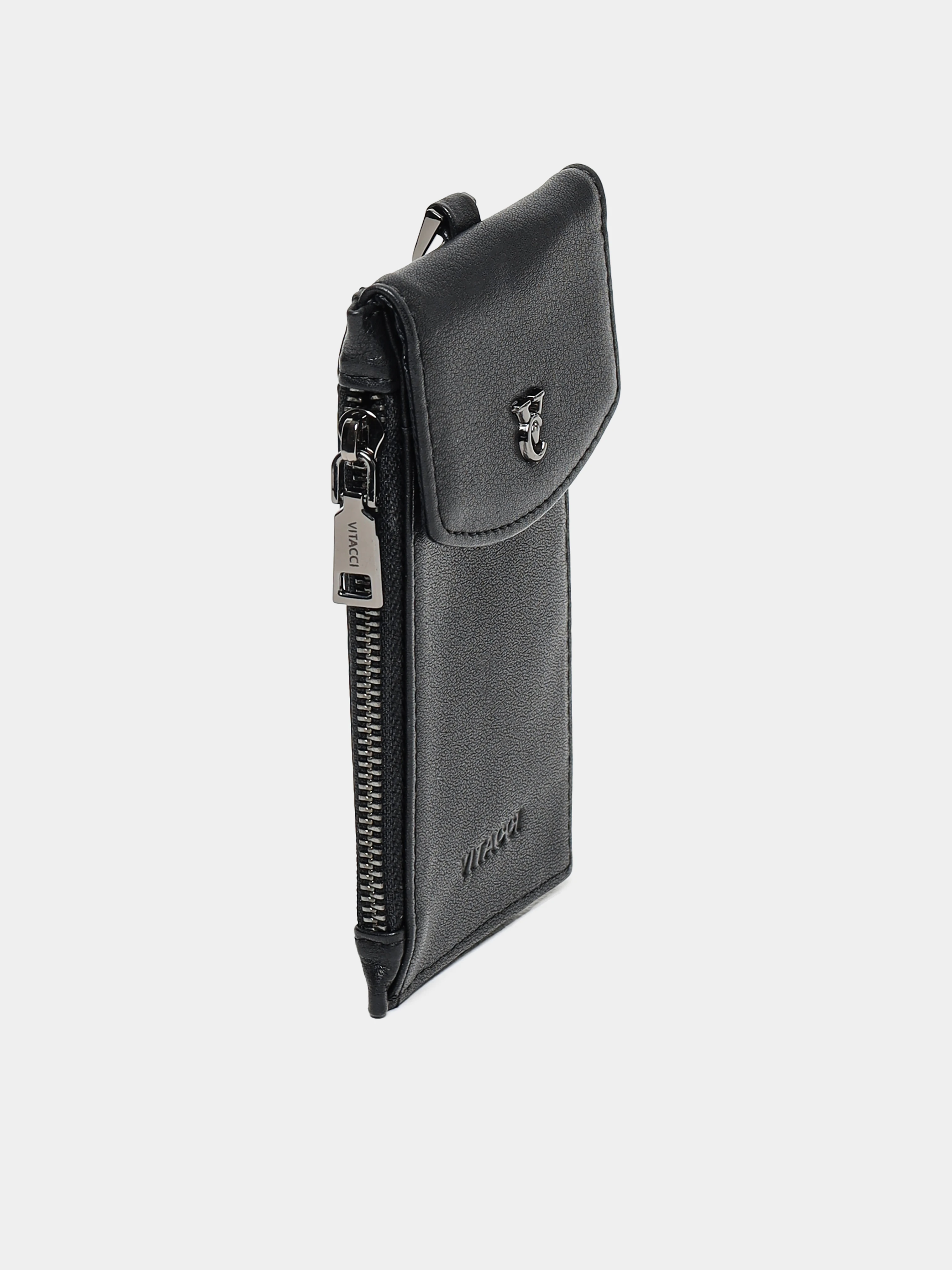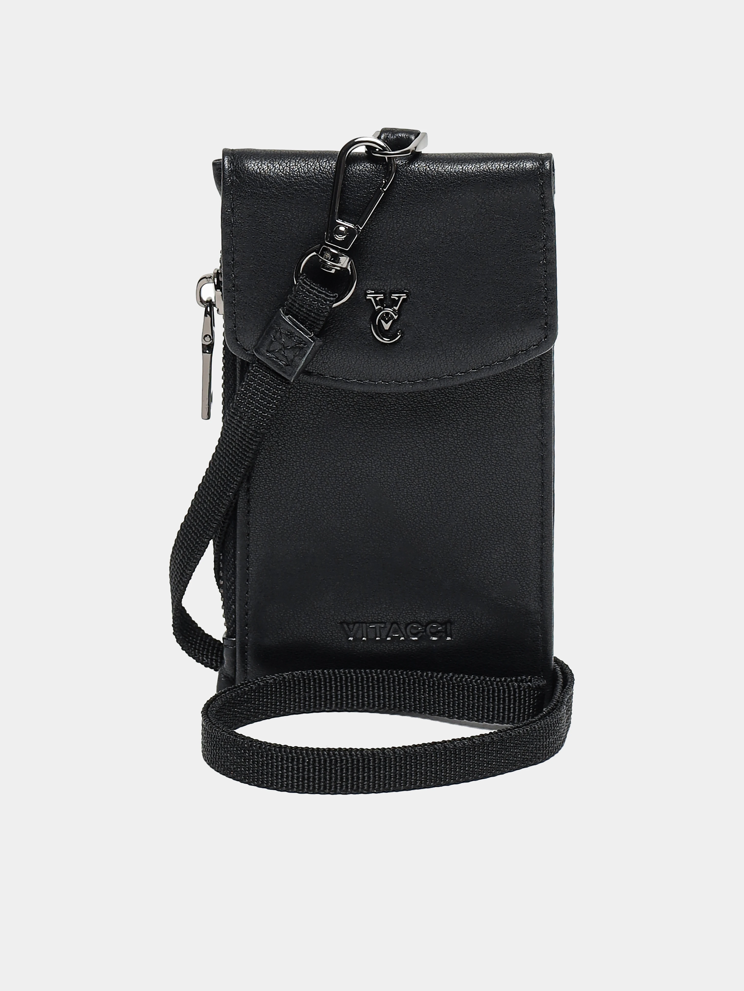 Кошелек из натуральной кожи. В комплекте прилагается ремешок с карабином для ношения на шее. Кошелек оснащен тремя отсеками для пластиковых карт, одним отделением на молнии и еще одним отделением на кнопке.