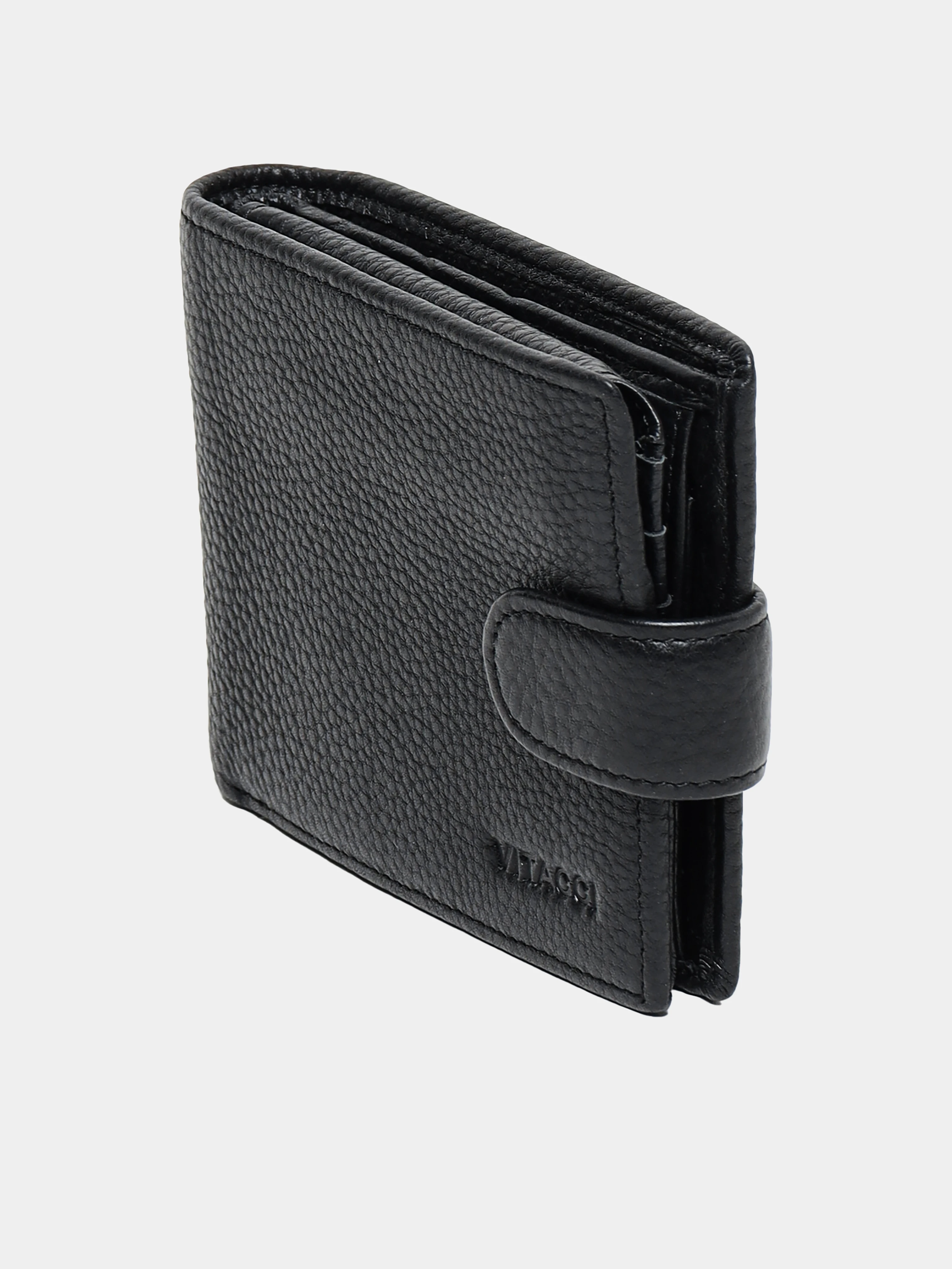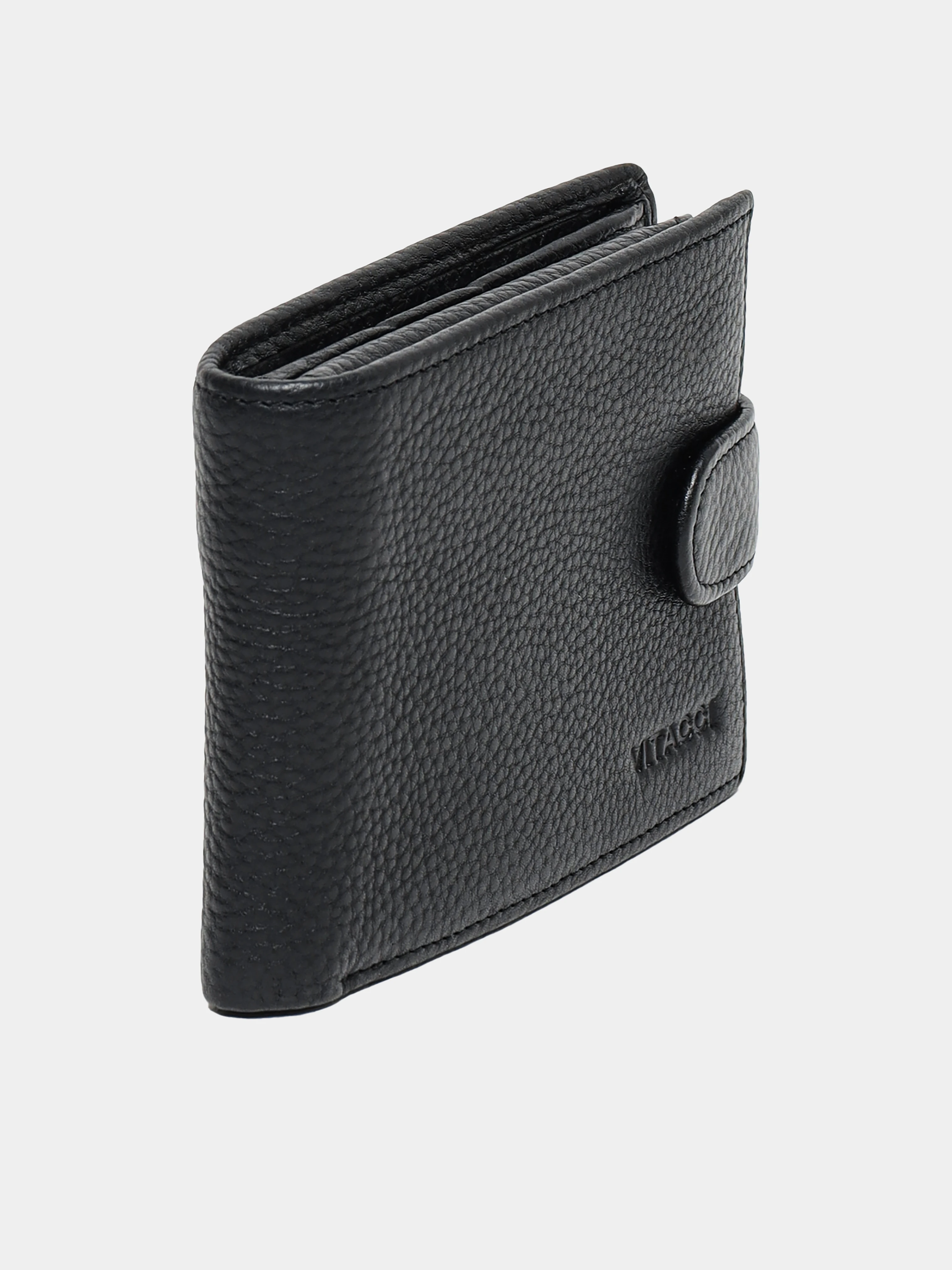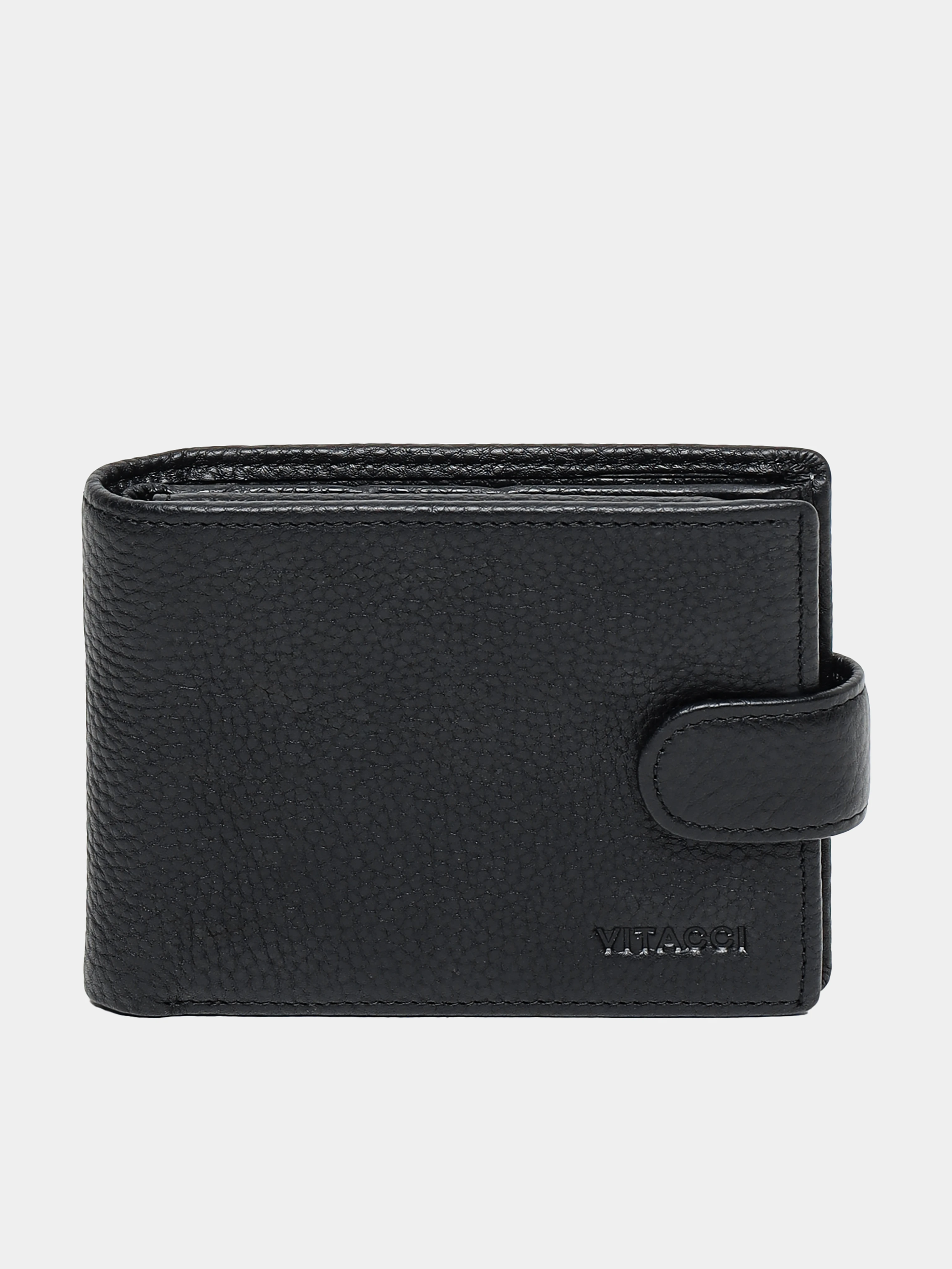 Мужское портмоне с застежкой в виде кнопки. Выполнено из натуральной кожи с зернистой фактурой. Оснащено отделениями для купюр, пластиковых карточек и монет.