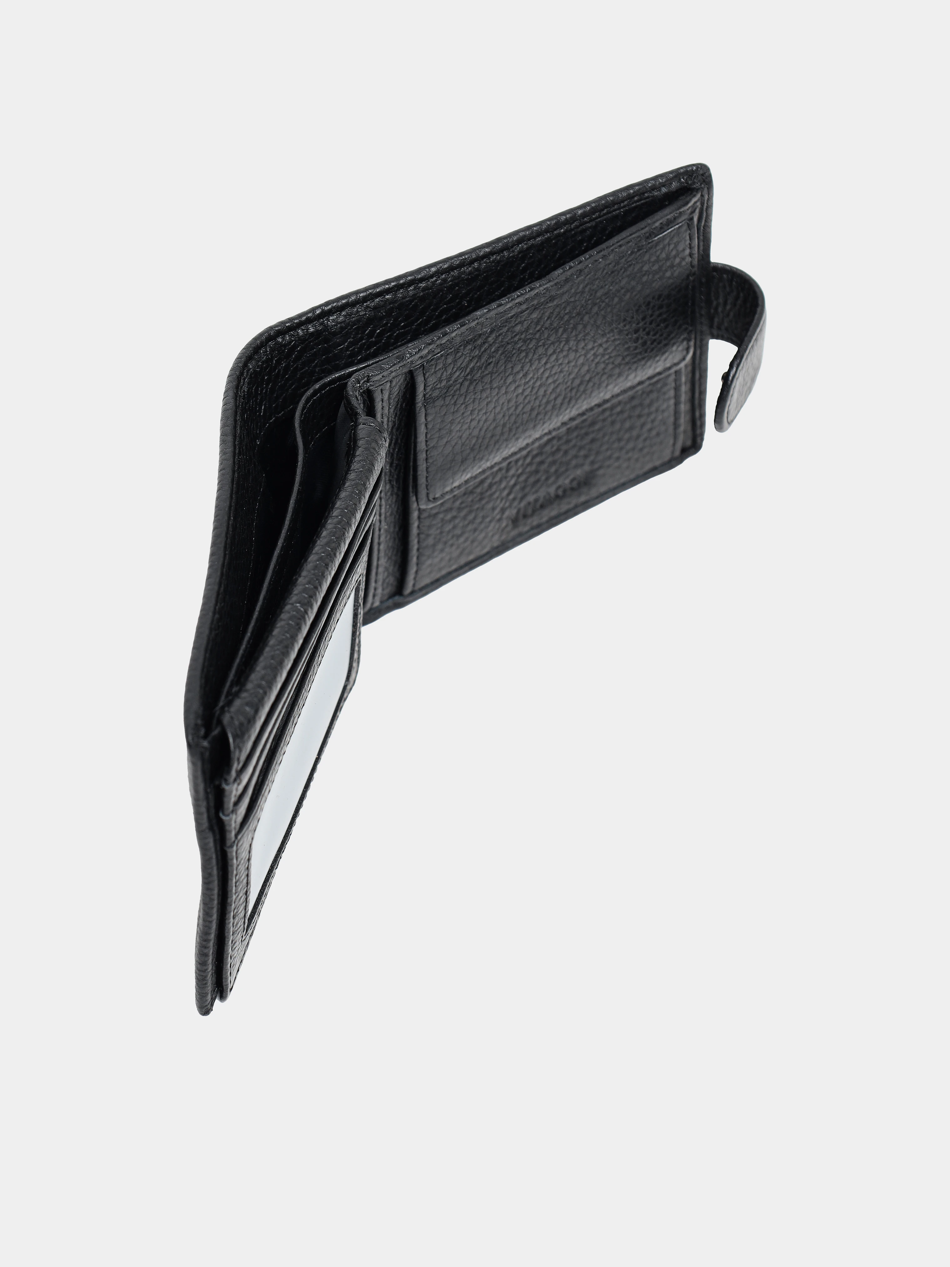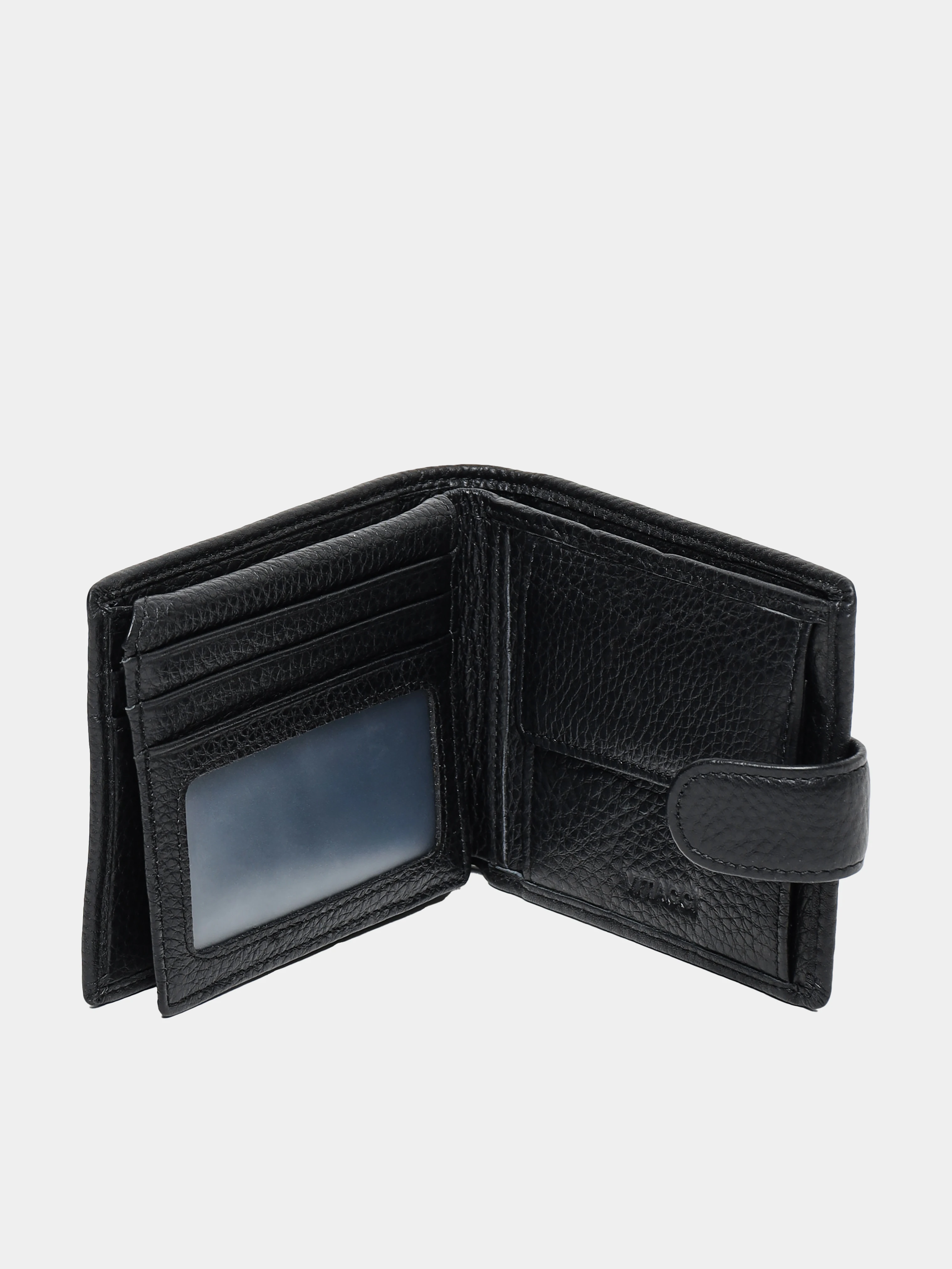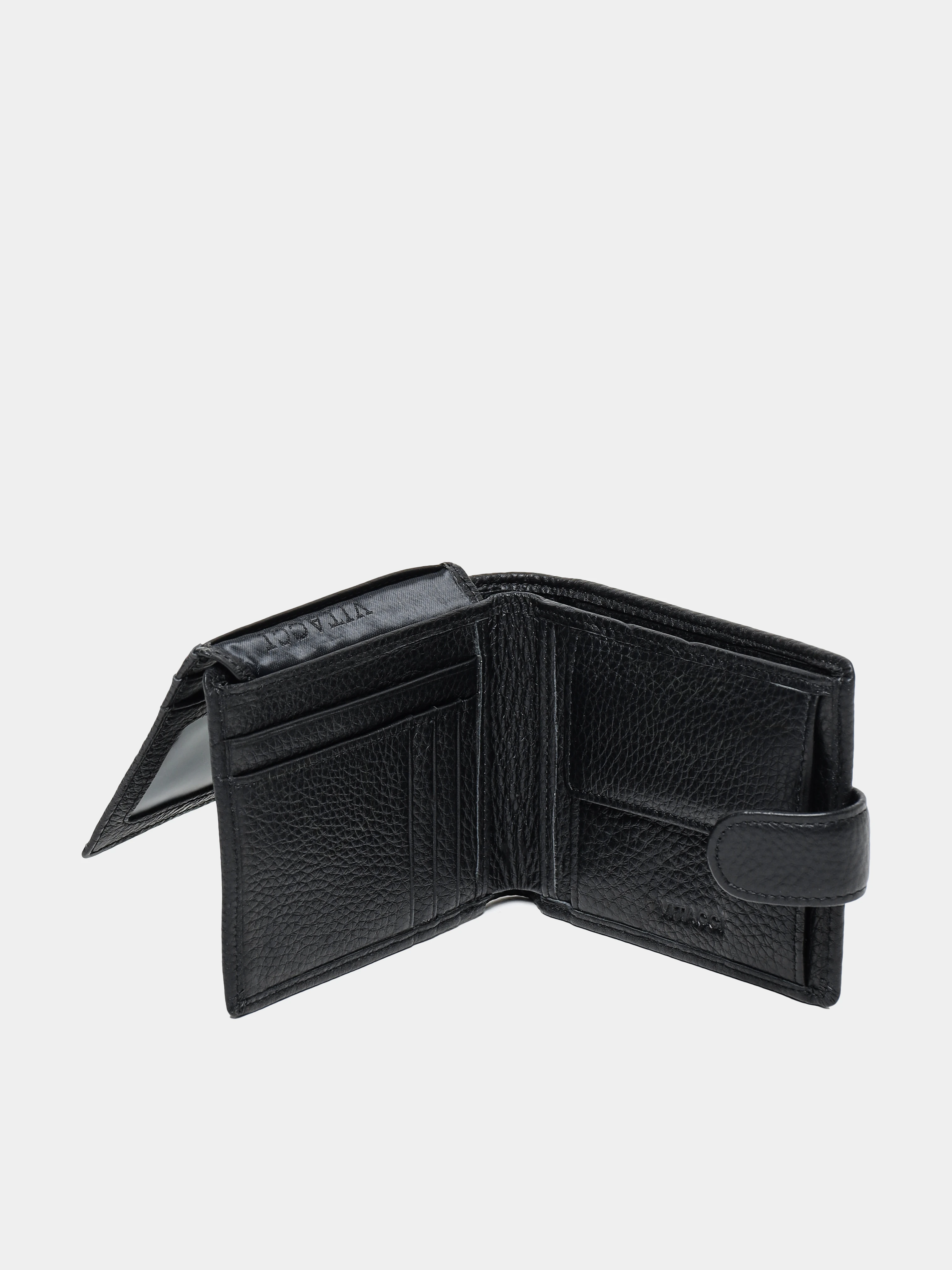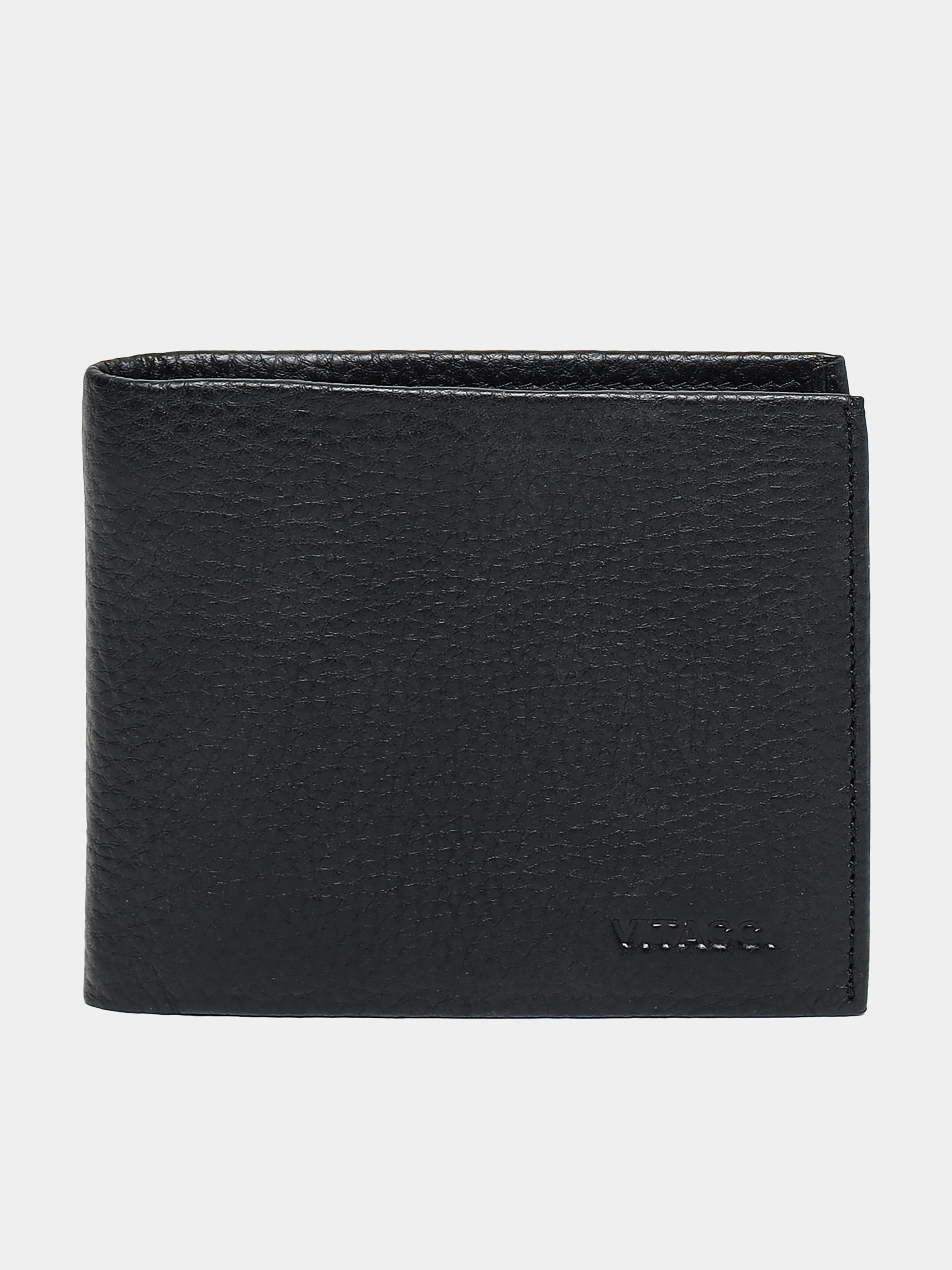 Мужское портмоне с застежкой в виде кнопки. Выполнено из натуральной кожи с зернистой фактурой. Оснащено отделениями для купюр, пластиковых карточек и монет.