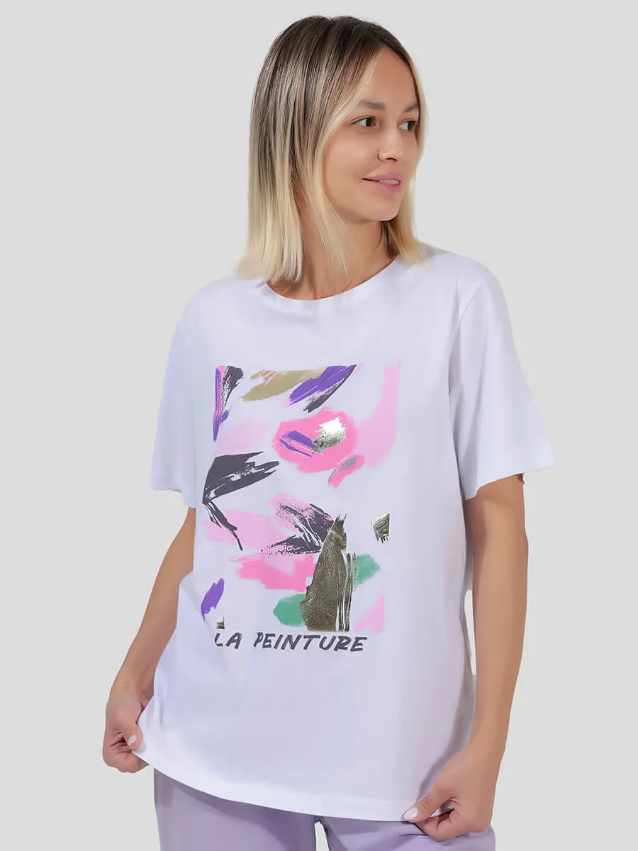 Спортивный костюм от VITACCI состоит из футболки и брюк. Футболка с круглым вырезом горловины выполнена из хлопка, а штаны - из хлопка с включением полиэстера. На футболке имеется абстрактный принт в цветовой гамме, которая сочетается с цветом брюк. Обхват груди: 40-42 (XS) - 100 см, 42-44 (S) - 106 см, 44-46 (M) - 110 см, 46-48 (L) - 116 см.