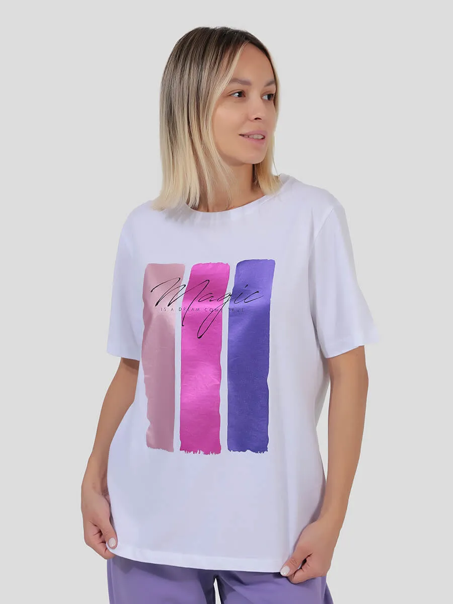Спортивный костюм от VITACCI состоит из футболки и брюк. Футболка с круглым вырезом горловины выполнена из хлопка, а брюки - из хлопка с включением полиэстера. На футболке имеется геометрический принт в цветовой гамме, которая сочетается с цветом брюк, и надпись в районе груди "Magic". Обхват груди: 40-42 (XS) - 98 см, 42-44 (S) - 102 см, 44-46 (M) - 106 см, 46-48 (L) - 108 см.