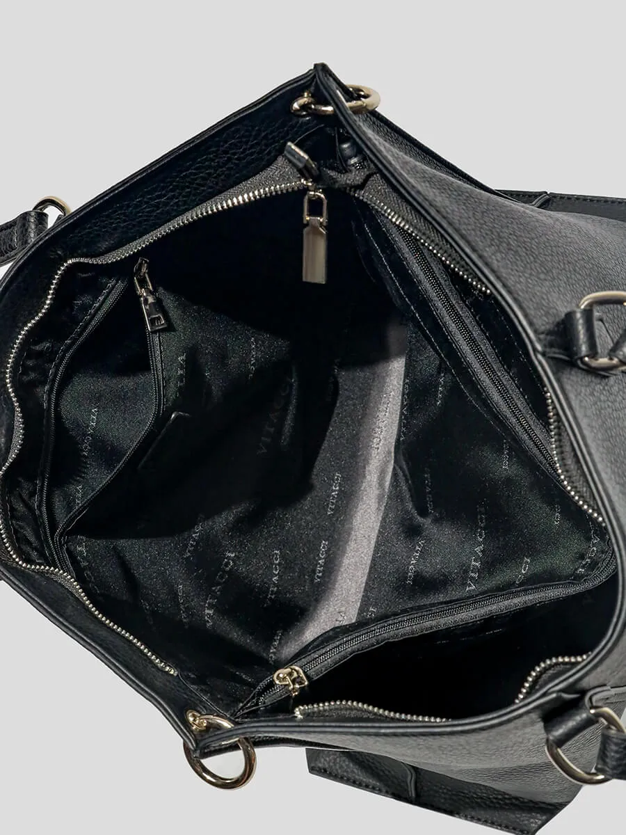 Сумка женская закрывается на молнию. Внутри три отдела, средний закрывается на молнию.