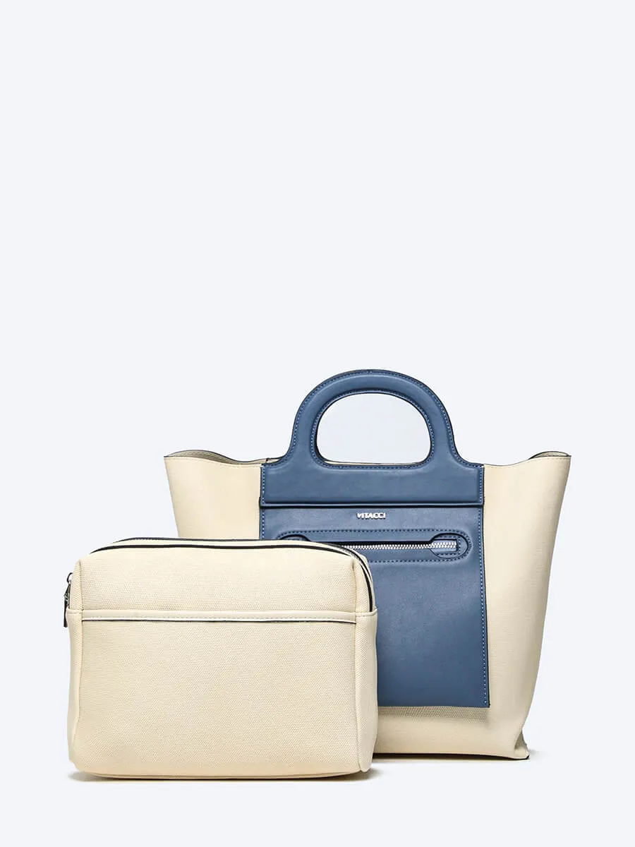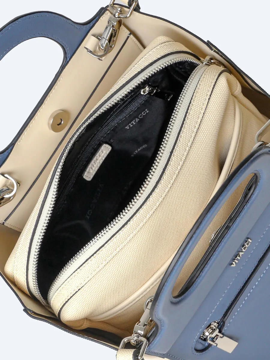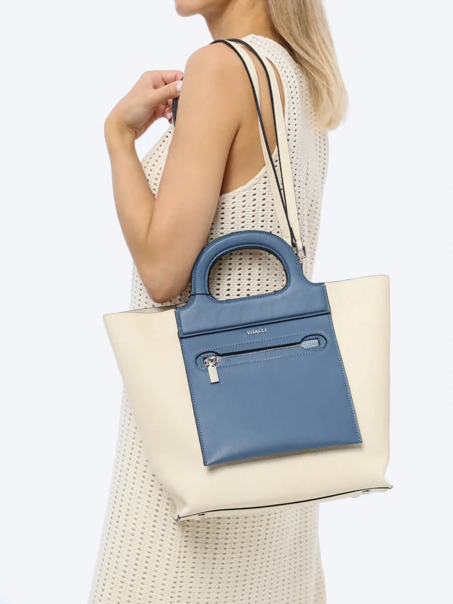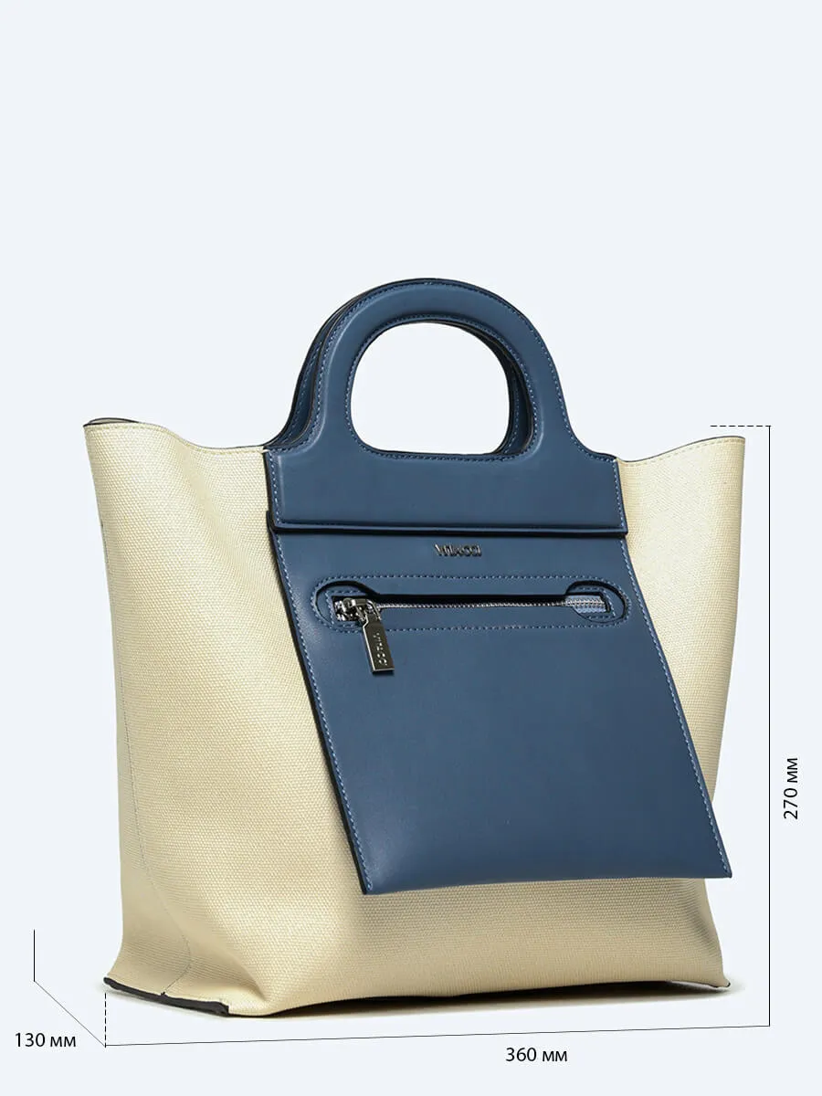 Сумка, состоящая из двух: большой тоут и маленькая кросс-боди. Внутри большой сумки имеется два кармана для документов.