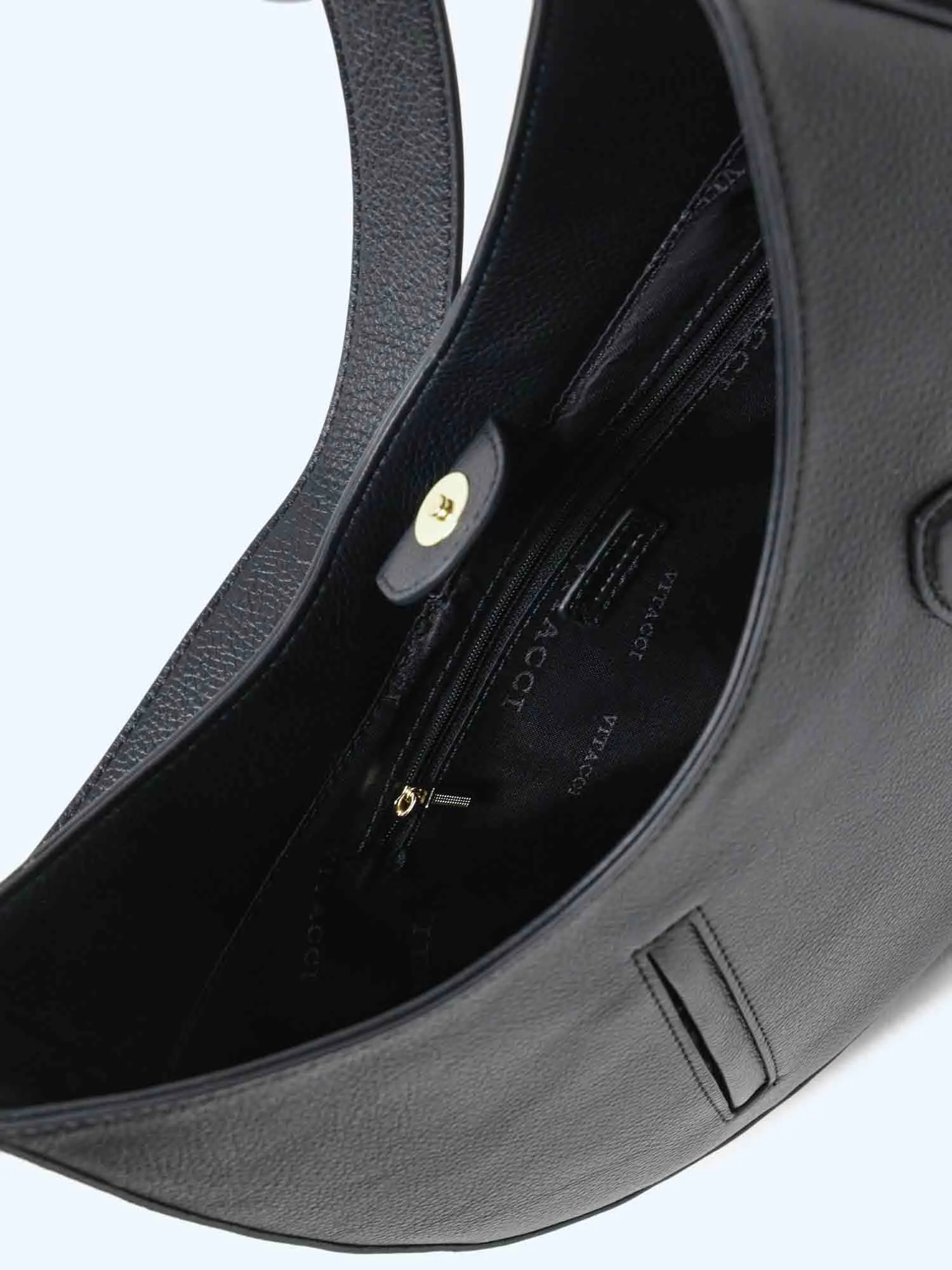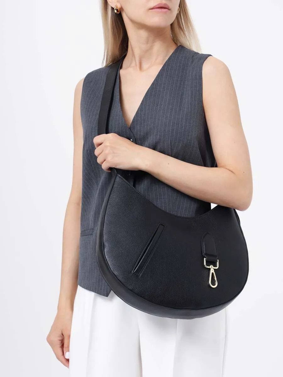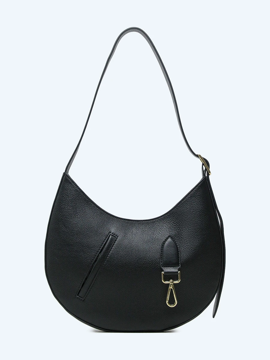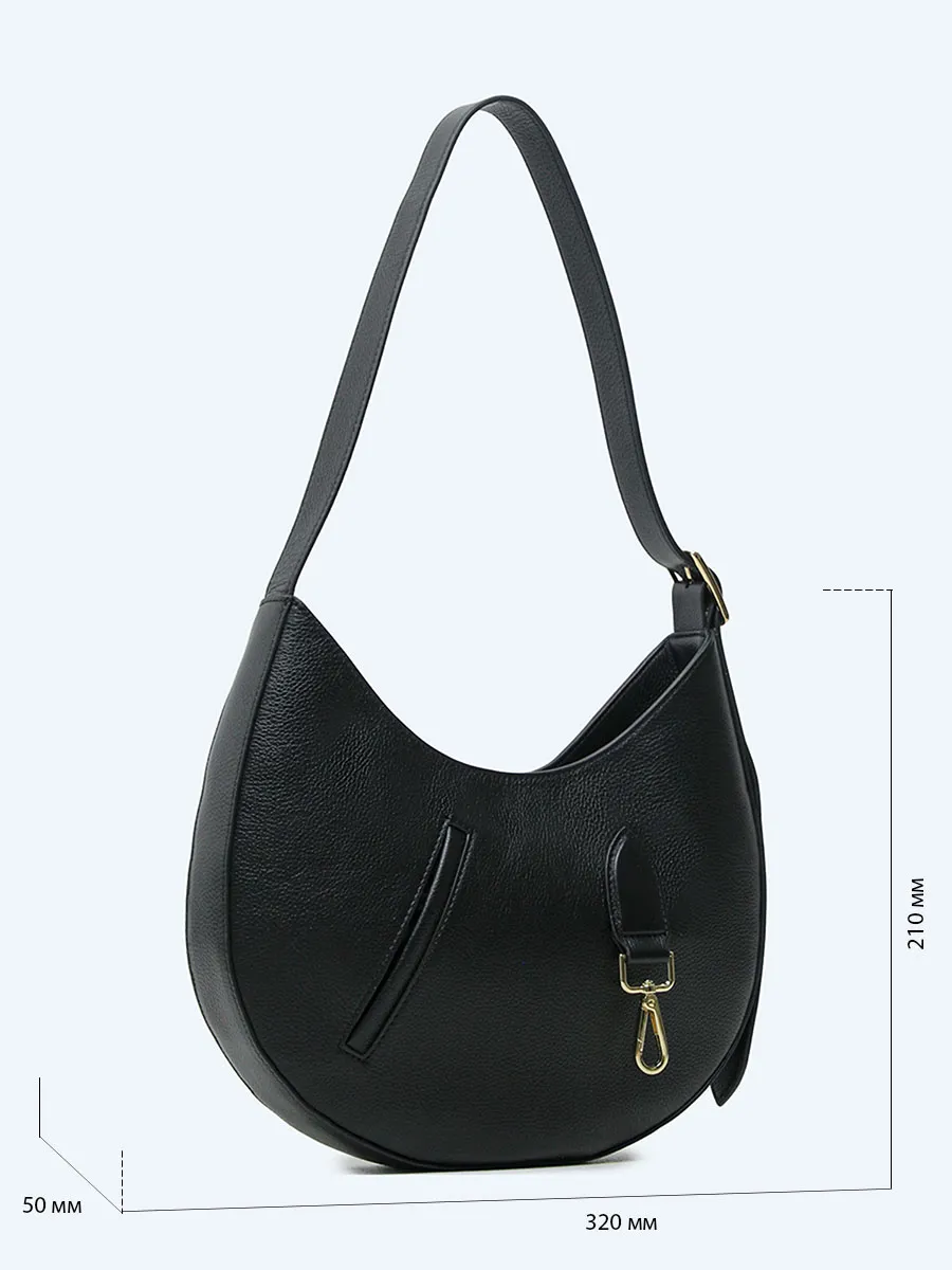Сумка из натуральной кожи оснащена карабином для крепления небольших аксессуаров. Имеет одно отделение. Плечевой ремень несъемный, но с возможностью регулировки длины.
