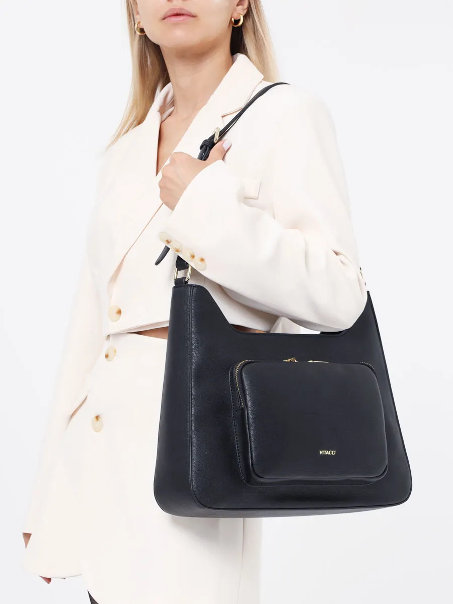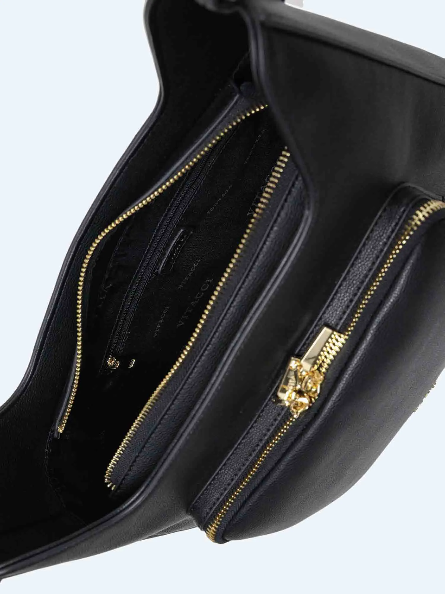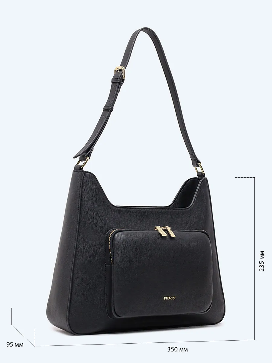 Сумка из искусственной кожи имеет карманы снаружи для быстрого доступа к необходимому и одно отделение внутри. Плечевой ремень несъемный, но с возможностью регулировки длины.