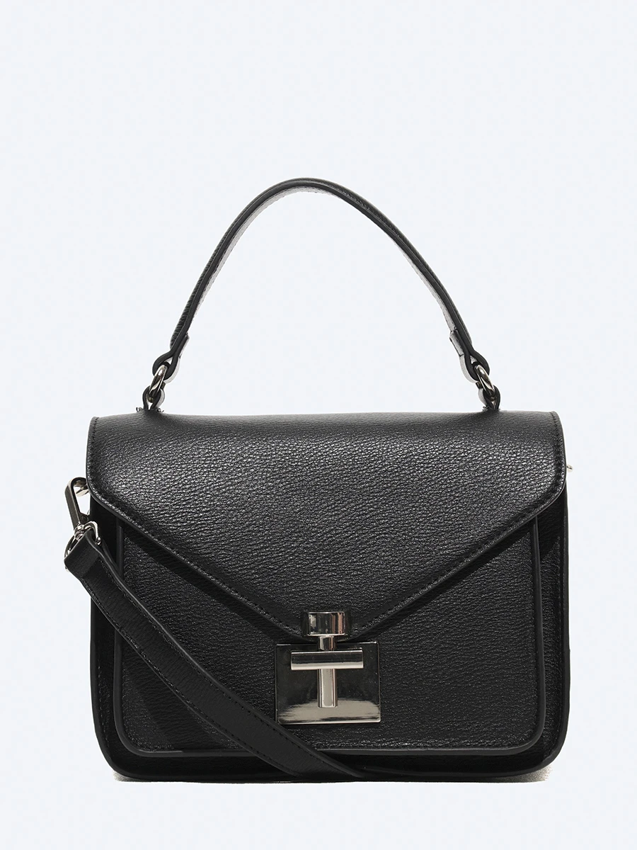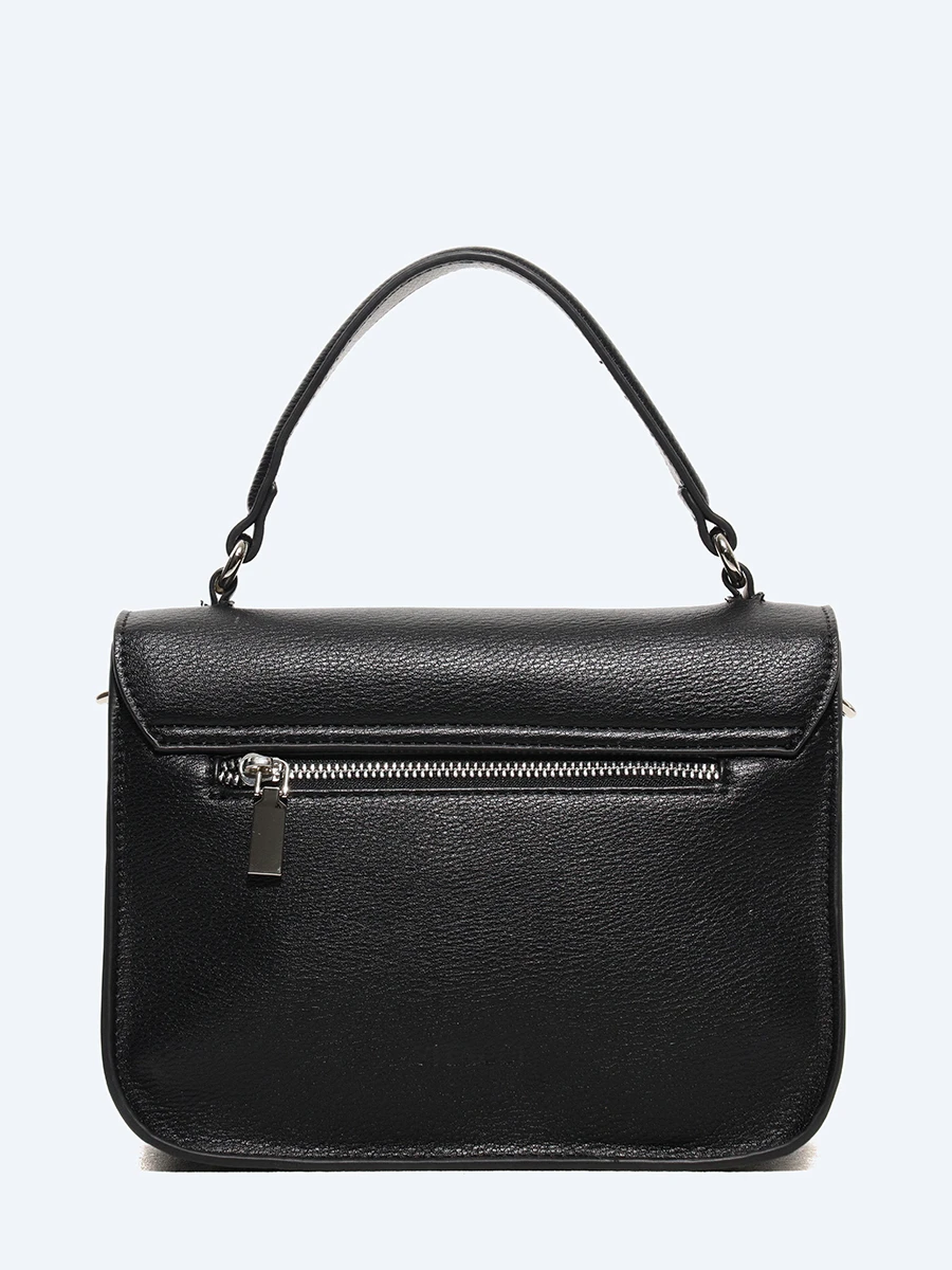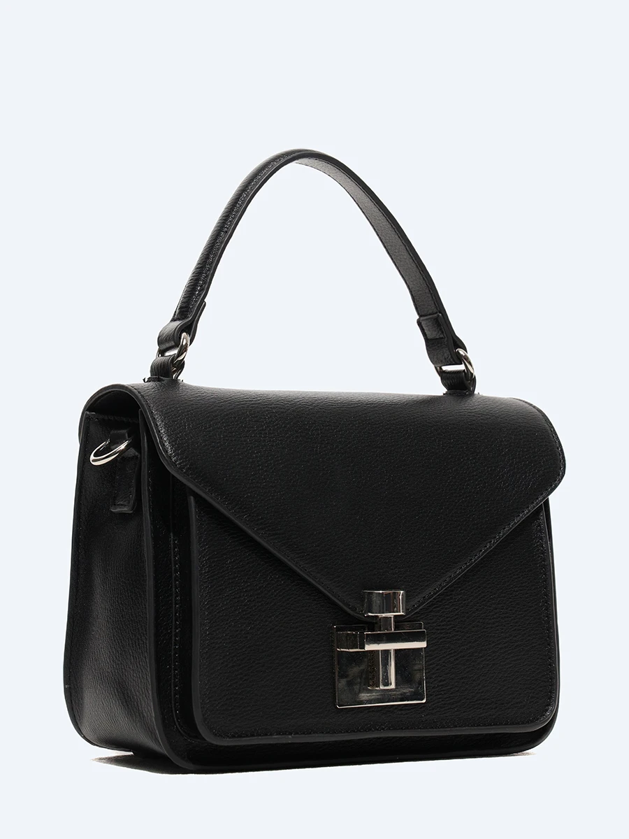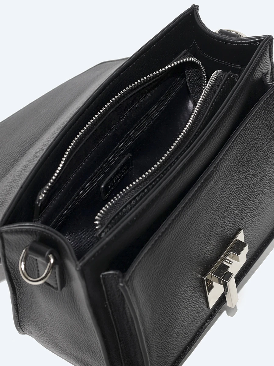Сумка из искусственной кожи закрывается на клапан с поворотным замком, имеет одно отделение на молнии и одно открытое, один внешний карман на молнии, один внутренний карман на молнии и один внутренний открытый карман. В комплекте съёмный длинный ремень.